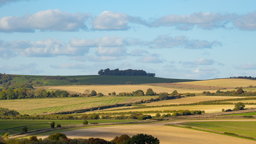 Looking back where we’d travelled from, Chantoncbury Ring’s mini-hillfort can be seen as a beech clump on the hill, but much smaller now.