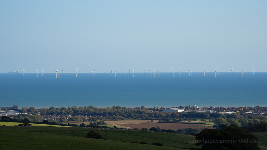 Out at sea you can get closer views of the white turbines of the windfarm. The development required cables to be dug into the landscape, with a long strip having to be cut through the Downs to reach the electricity terminal. One person I know who lives in Hove said they were comforted by the red flashing lights on the horizon at night.