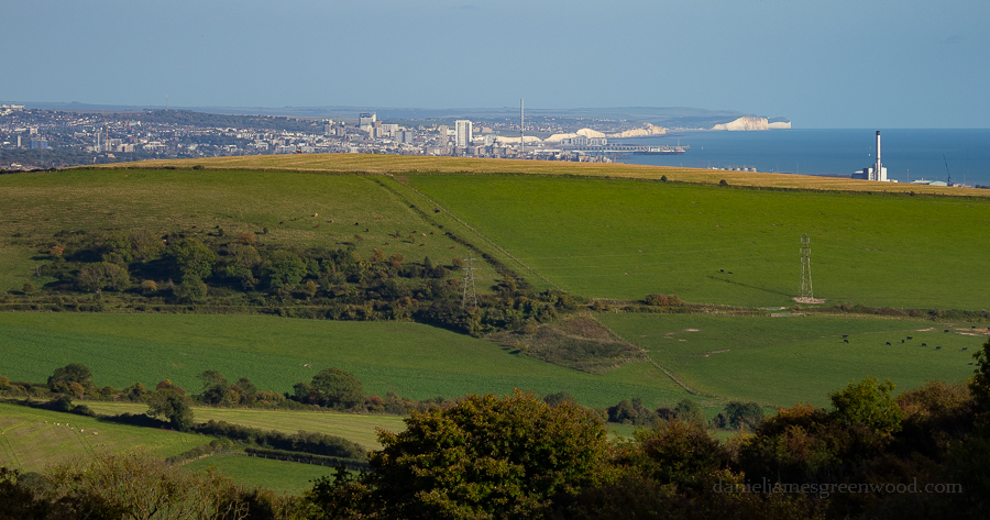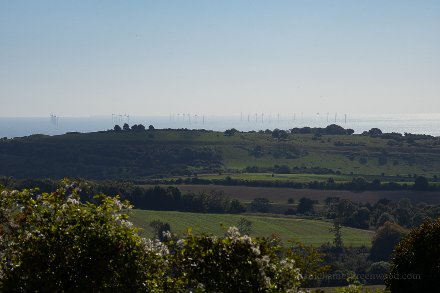 Immediately upon ascending the Downs, you can get good views south to Cissbury Ring, a hillfort much, much bigger than Chanctonbury Ring. In the distance are views of the south coast and, in this image, the Rampion windfarm. It’s named after ‘the pride of Sussex’, round-headed rampion, a flower more common in the South Downs.
