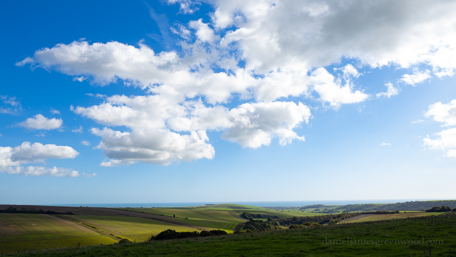 The resplendent South Downs set against a ribbon of blue sea and cloud-scattered sky.
