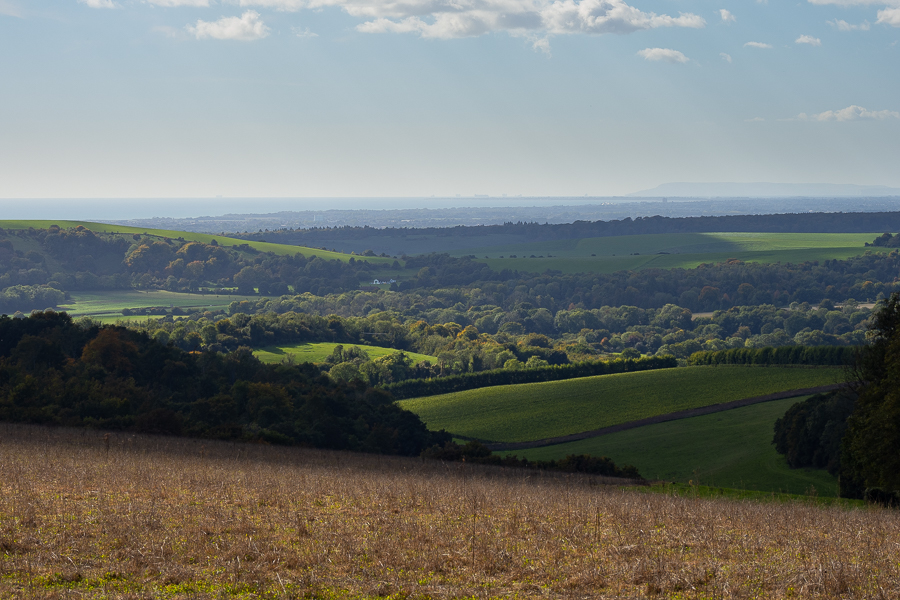 There’s a southern turning to take towards Cissbury Ring and off the South Downs Way. The track leads alongside arable fields and shooting cover. In this view the distant shape of the Isle of Wight is visible in the top right.