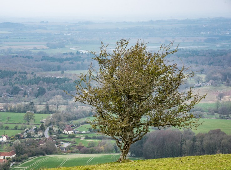 This hawthorn faces out over the Arun Valley towards Pulborough. The Low Weald is hidden by mist in the north.