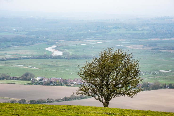 A hawthorn obscuring a village built along spring-lines. The Arun snakes away in the background.