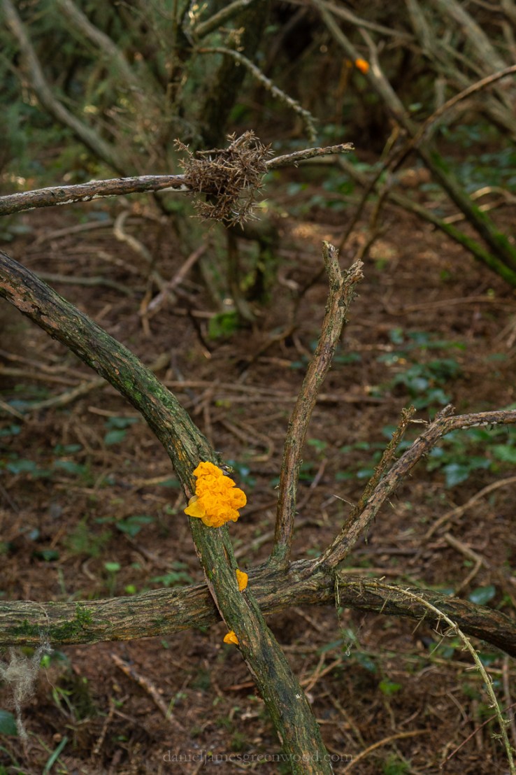 The gorse forms a scrubby woodland and provides ample habitat for one of the most striking species of fungus: yellow brain. It’s also known as witches’ butter, a lovely colloquial name that hints at the role fungi has in British folklore.