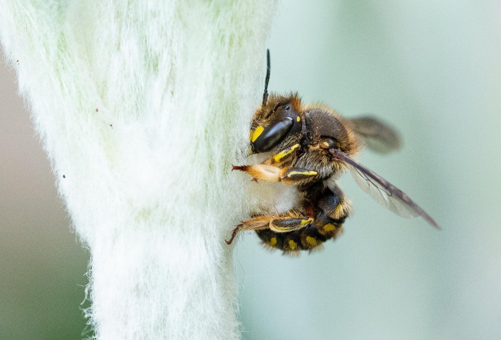 ‘A couple of weeks ago I noticed a new species visiting the lambs’ ears in my garden. After work I had gone into the garden to morph into a normal human again. The sun had moved to the point where shade was covering the flowerbeds but still an insect was busy and behaving in an unusual way.’