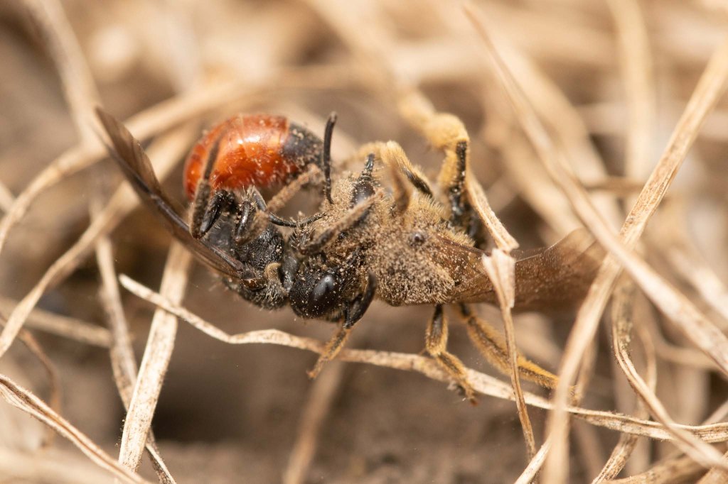 I have mentioned before that part of my lawn is dying, likely due to the lack of spring rain. I don’t mind this because it annoys people who like tidy gardens and it provides a habitat niche for wildlife. In this case, it was for the benefit of yellow-legged mining bees (I still haven’t confirmed that ID but will go with it). The ground will recover anyway in the autumn and winter. I was sitting on the grass to see if some of the mining bees would be coming out. I noticed a dead bee and took a photo. Then I noticed another one. There was another insect hovering over the area of mining bee nests which at first thought was something like a ruby-tailed wasp, as I could see its red ‘tail’ or lower body. I was desperate for it to land so I could get a photo. When it did, I was amazed at what happened next.
