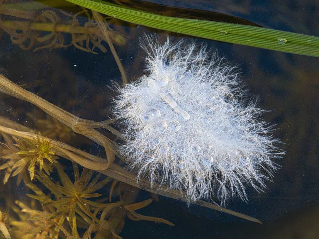 One morning I spotted a downy feather resting on the pond’s surface with some drops of dew sitting on it. Looking closely the feather’s fibres were like lightning bolts or fungal hyphae spreading out across the surface of the water. I was crouched down over the pond to the point that the postman didn’t see me and got a fright:
