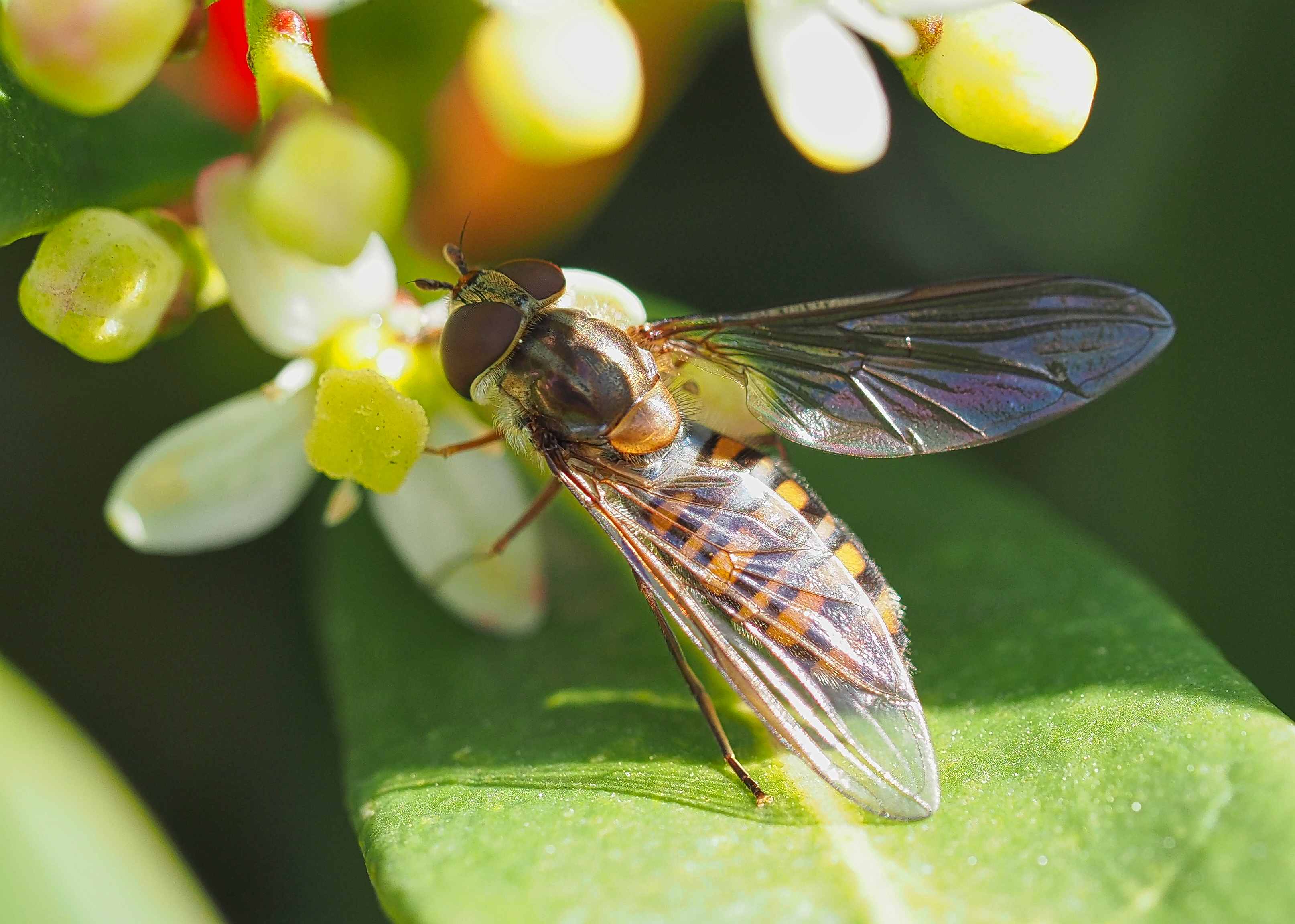 Another sign of my rustiness is this sighting of a queen wasp visiting the small hedge. She was nectaring on flowers of the-plant-I-can-never-remember-the-name-of. I have posted quote a lot in the past year about wasps, I love them. A user on iNaturalist identified this as a common wasp queen, Vespula vulgaris.The same plant was supporting both more species and the non-sensical notion that non-native plants or animals have no place on These Great Isles. This was perhaps the second or third marmalade hoverfly I have seen in the garden this year. They are a nice entry into the world of hovers and are super common.
